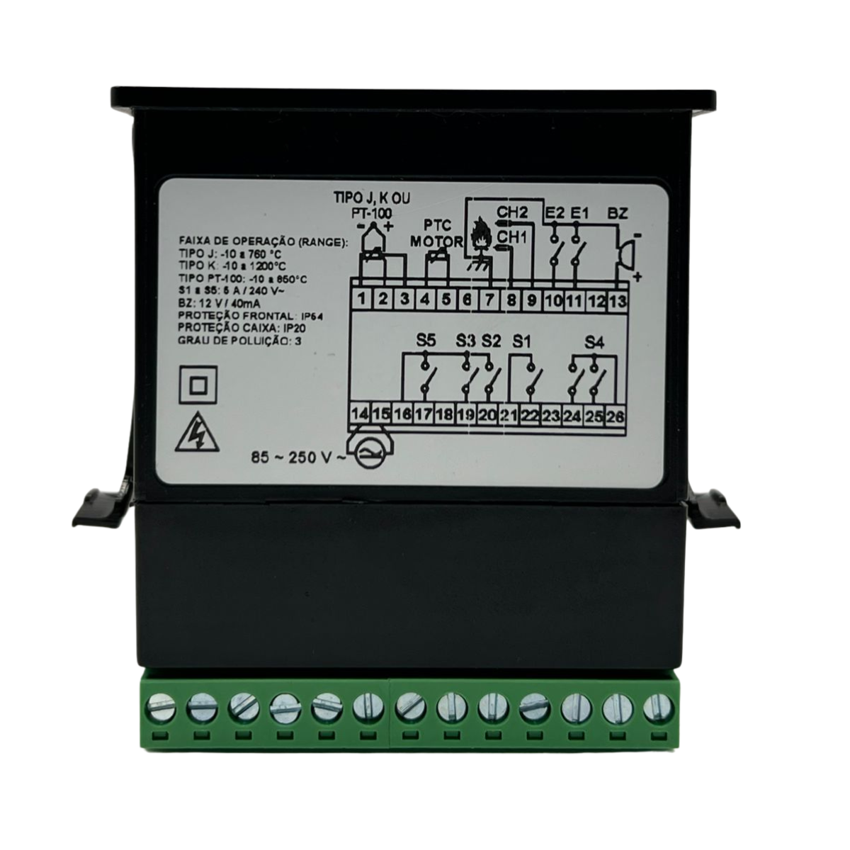• Medição e controle (Termopar Tipo J): -10°C a 760°C